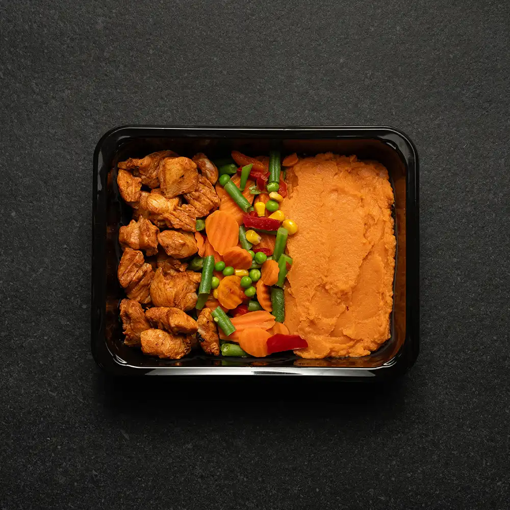 Koostisosad: Bataadipuder 33,33%. Köögiviljasegu 33,33% [viilutatud porgandid, suhkrumais 20%, aedherned, tükeldatud oad, punase paprika ribad 15%]. Kanafilee 33,33% [Kanafilee 92% (ilma naha ja kondita), sool, suhkur, VÜRTSID (tšilli, must pipar, suitsupaprika, köömned, cayenne’i pipar), dekstroos, küüslauk, sibul, E16C (paprikaekstrakt), palmiõli, ürdid, pune, vürtsiekstrakt, kapsium.]. Säilitamine: Temperatuuril vähemalt -18ºC. Parim enne kuupäev märgitud pakendil. Pärast sulatamist mitte uuesti külmutada.